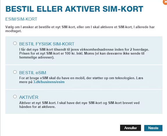 Bestil et SIM-kort eller eSIM via 3Business Selvbetjeningen. Et fysisk SIM-kort sendes til din CVR-adresse inden for to arbejdsdage, mens eSIM'et kan scannes med det samme. Se guiden til bestilling i vores vejledninger.