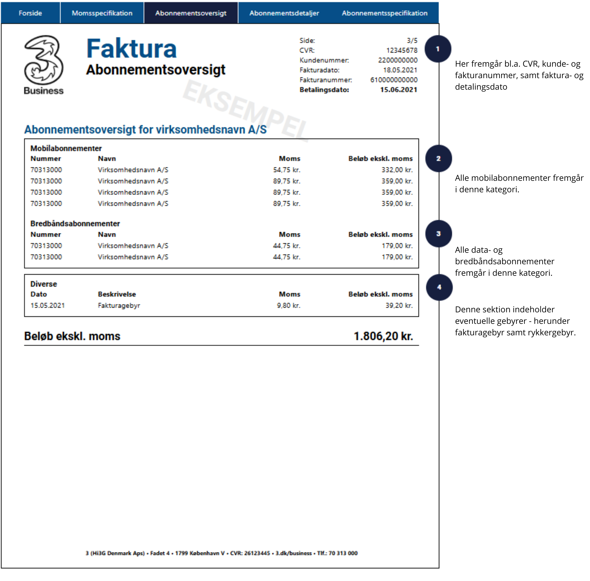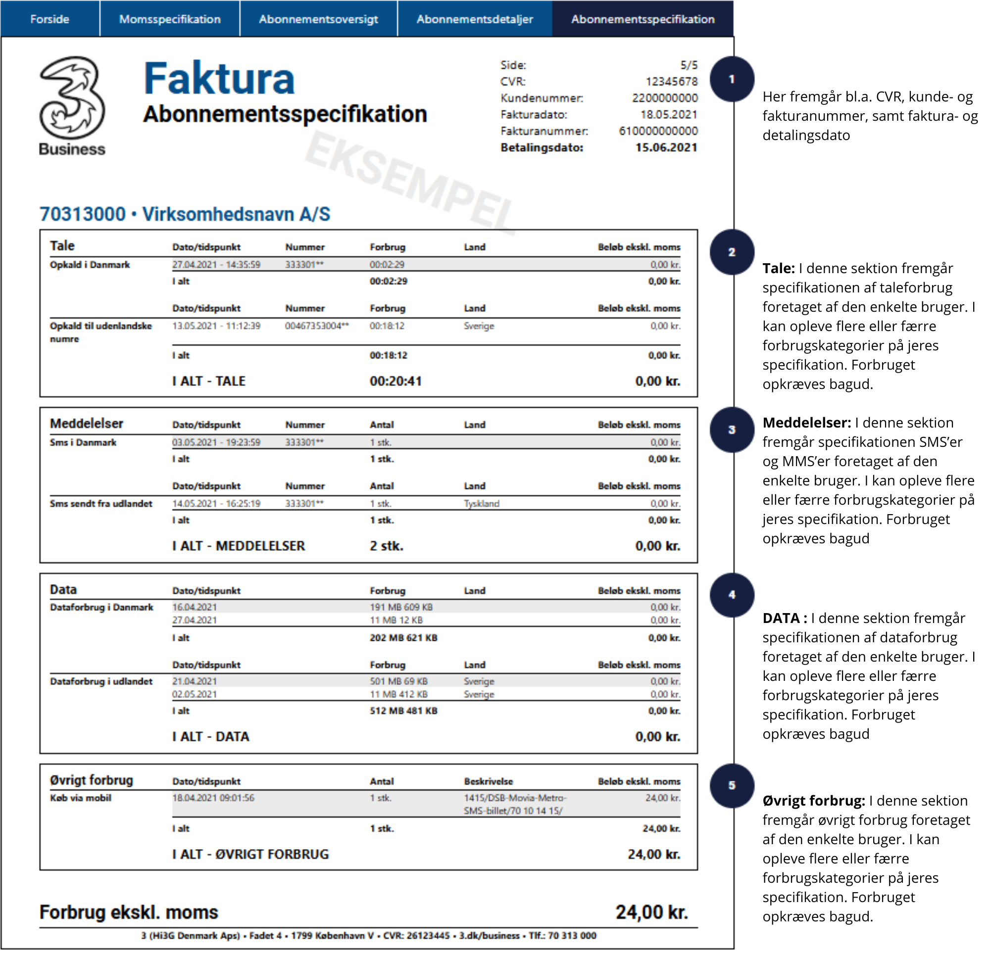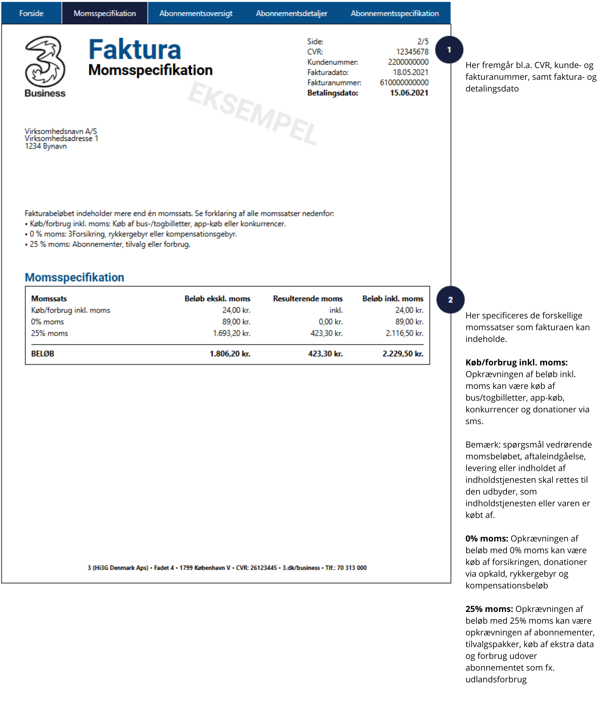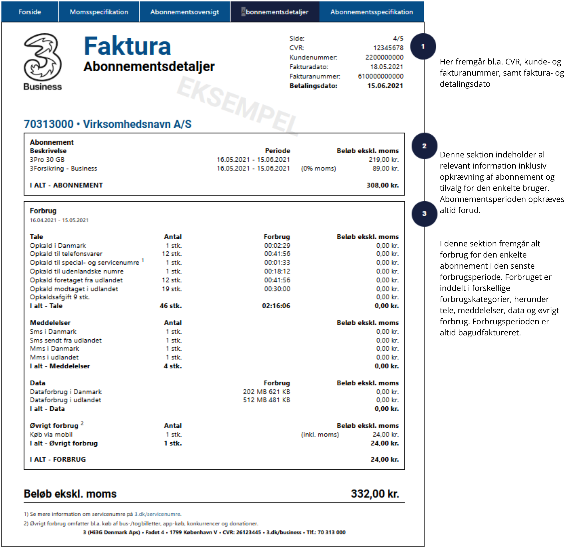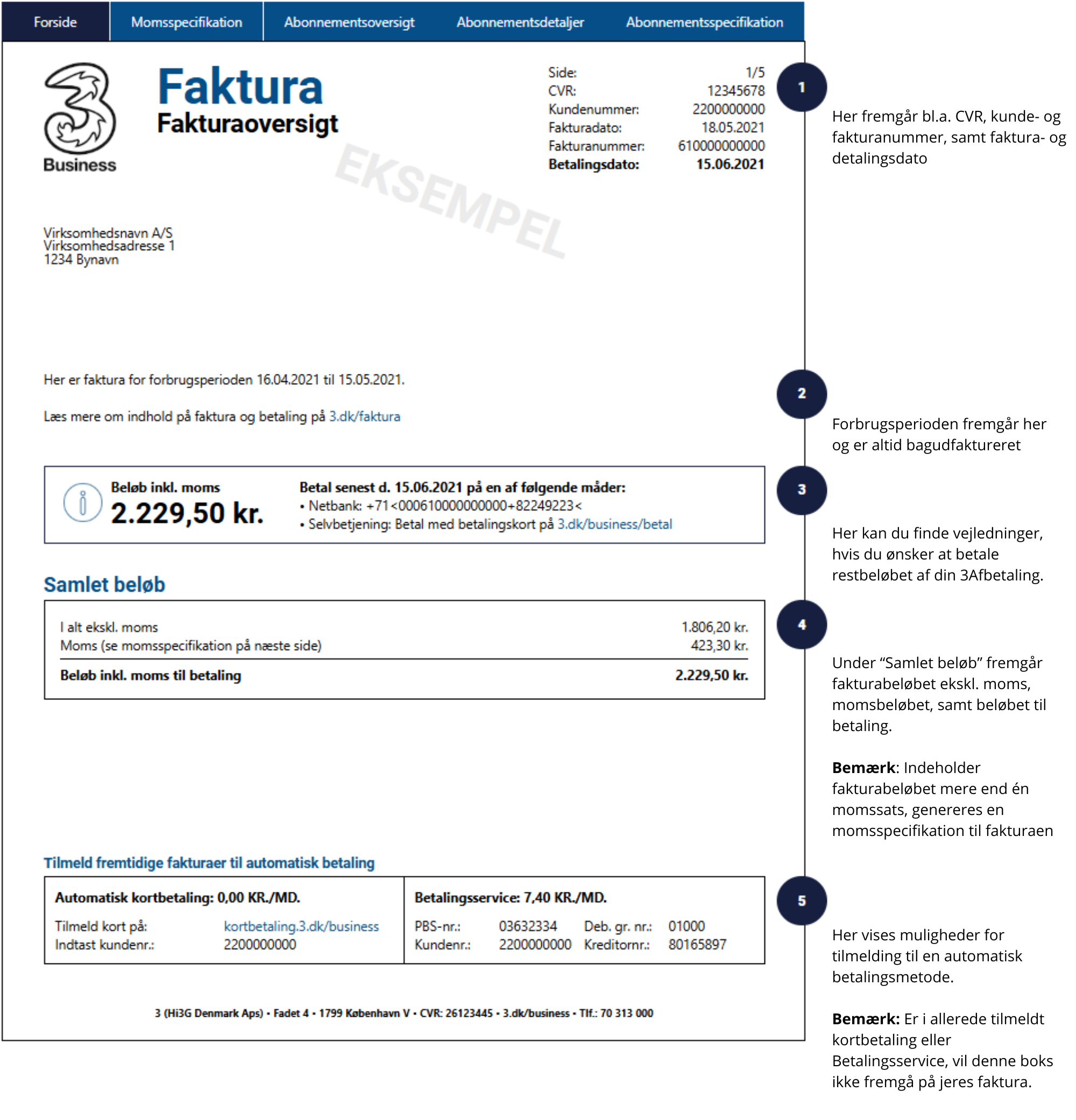 Læs forklaringer om indholdet på fakturaen ved tallene i højre side.