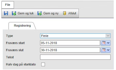 Udfyld Type samt de ønskede dage. Afslut ved at trykke på gem og luk.