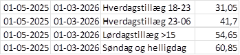 Herunder ses lønningerne efter de pågældende satser for forkudttidstillæg.