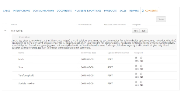 Ønsker kunden slet ikke at blive kontaktet igen, skal du også markere nej til telefonopkald i Care under Consents (se nedenstående billede)